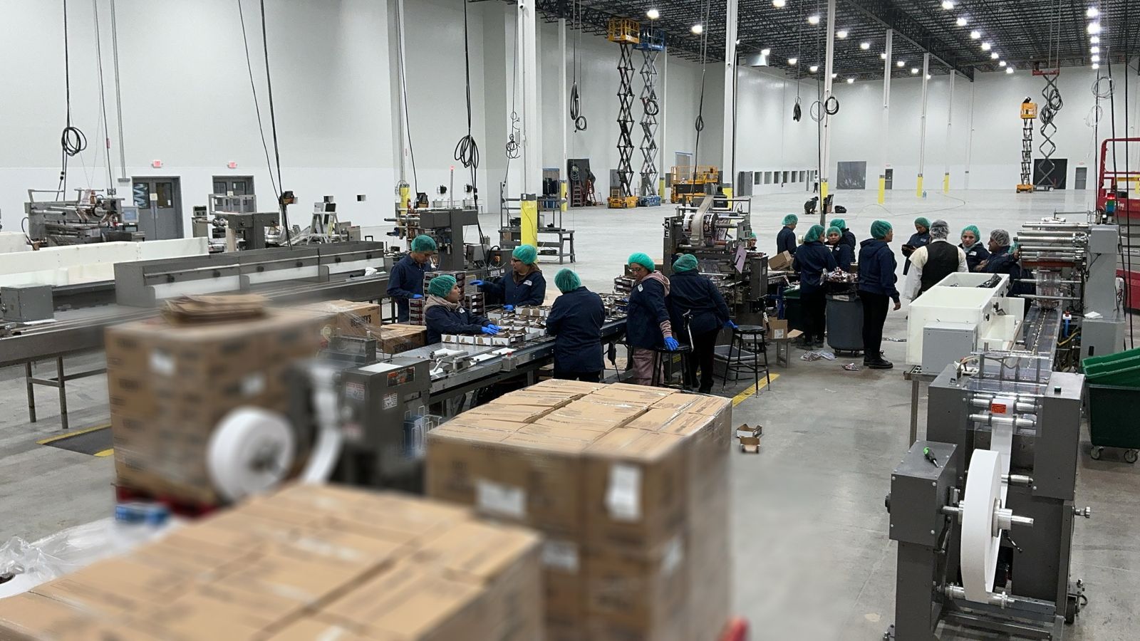 The room that only weeks ago held construction materials is now operating as a live production environment. Machines are moving product, team members are packing and assembling, and the workflow of a functioning line is officially underway.
